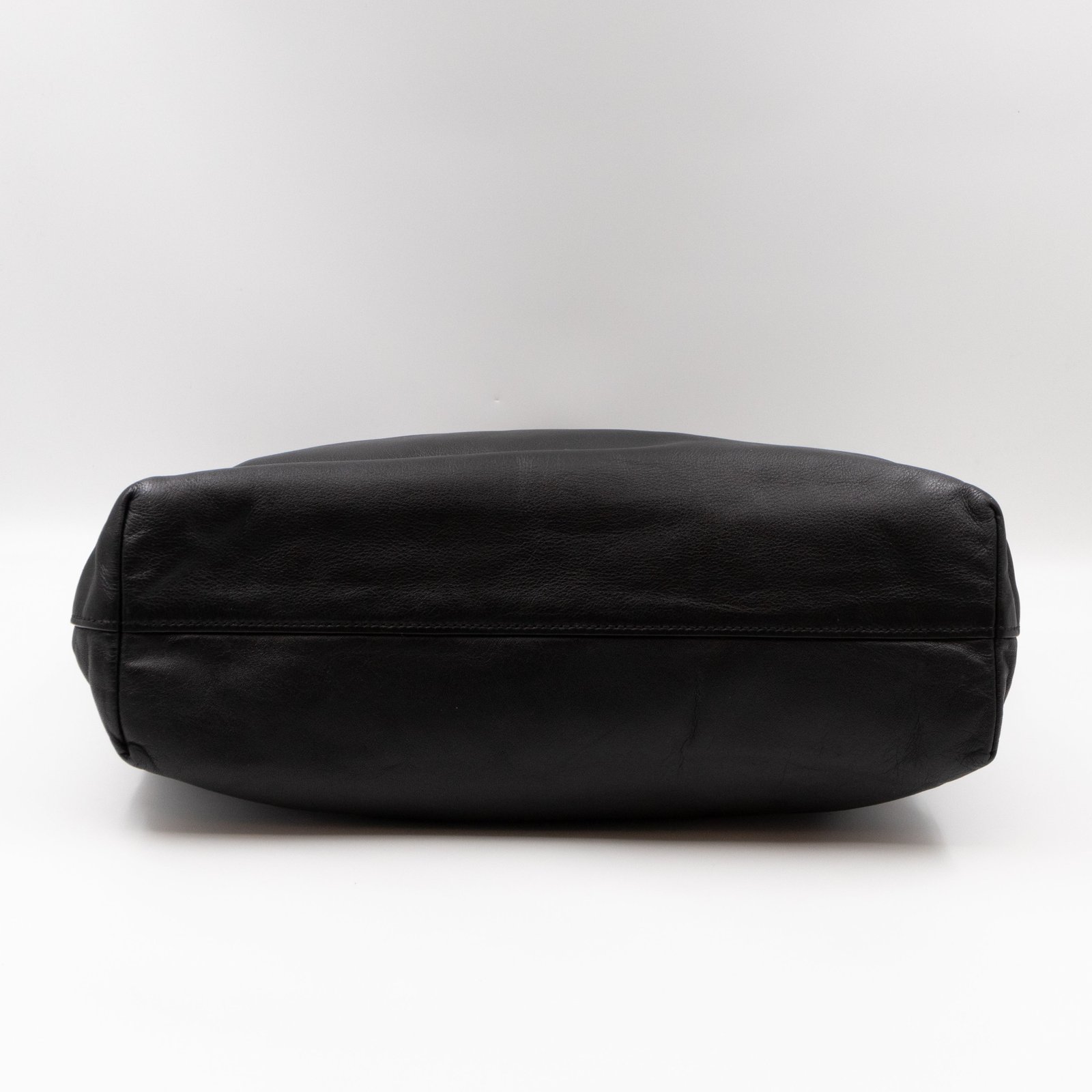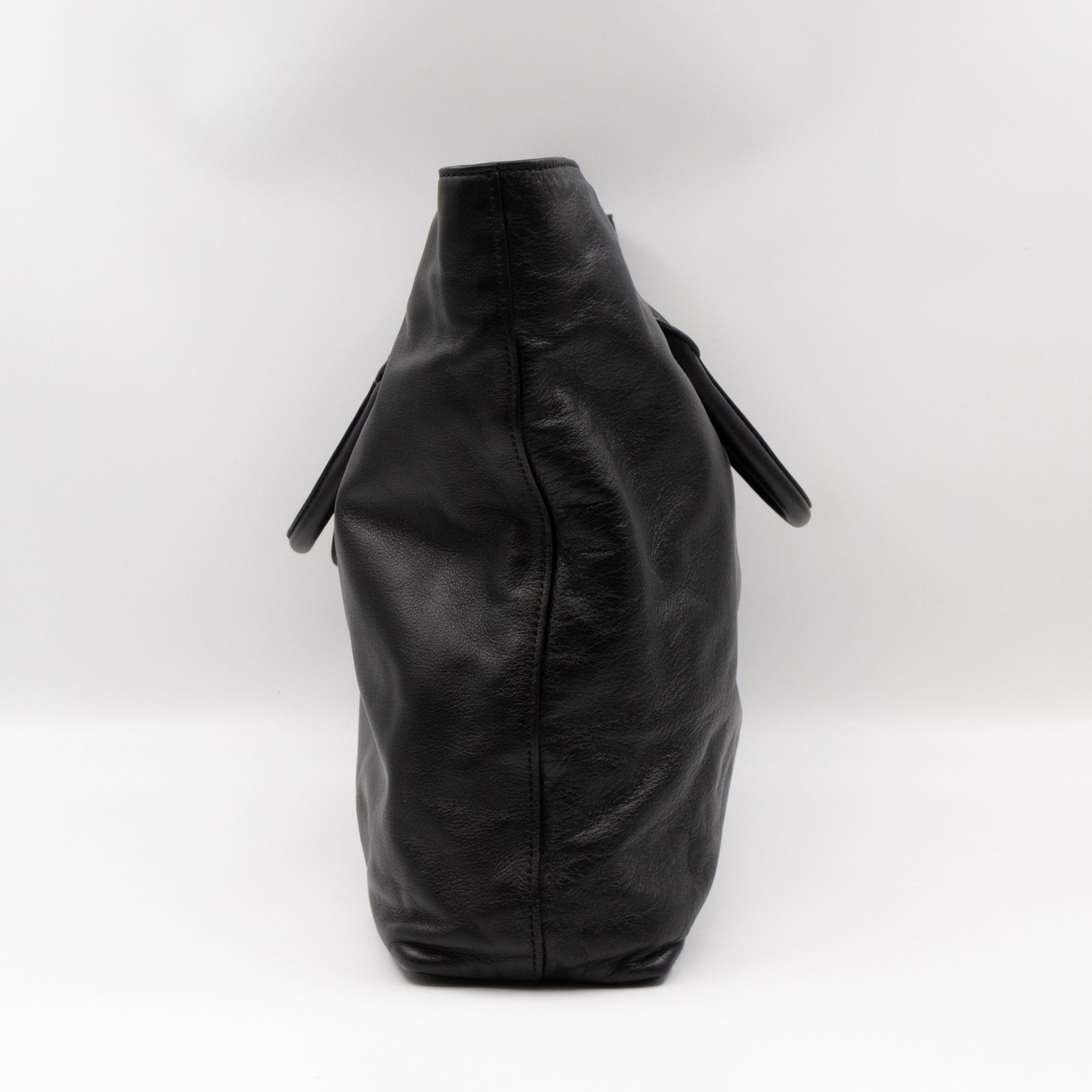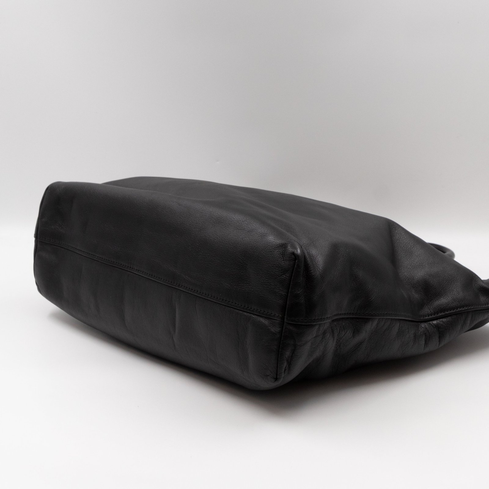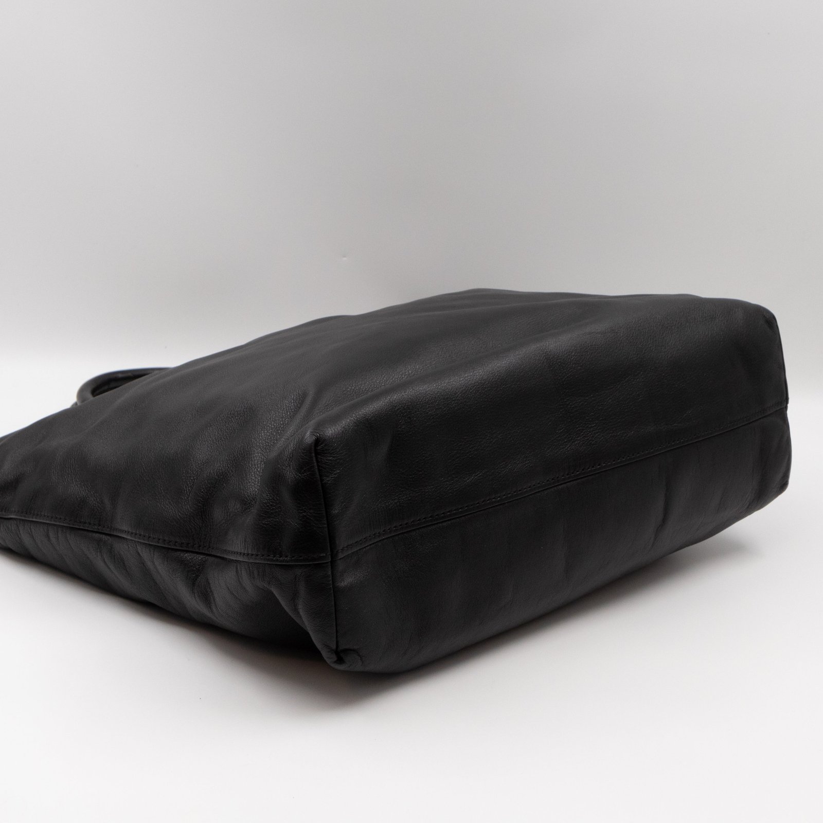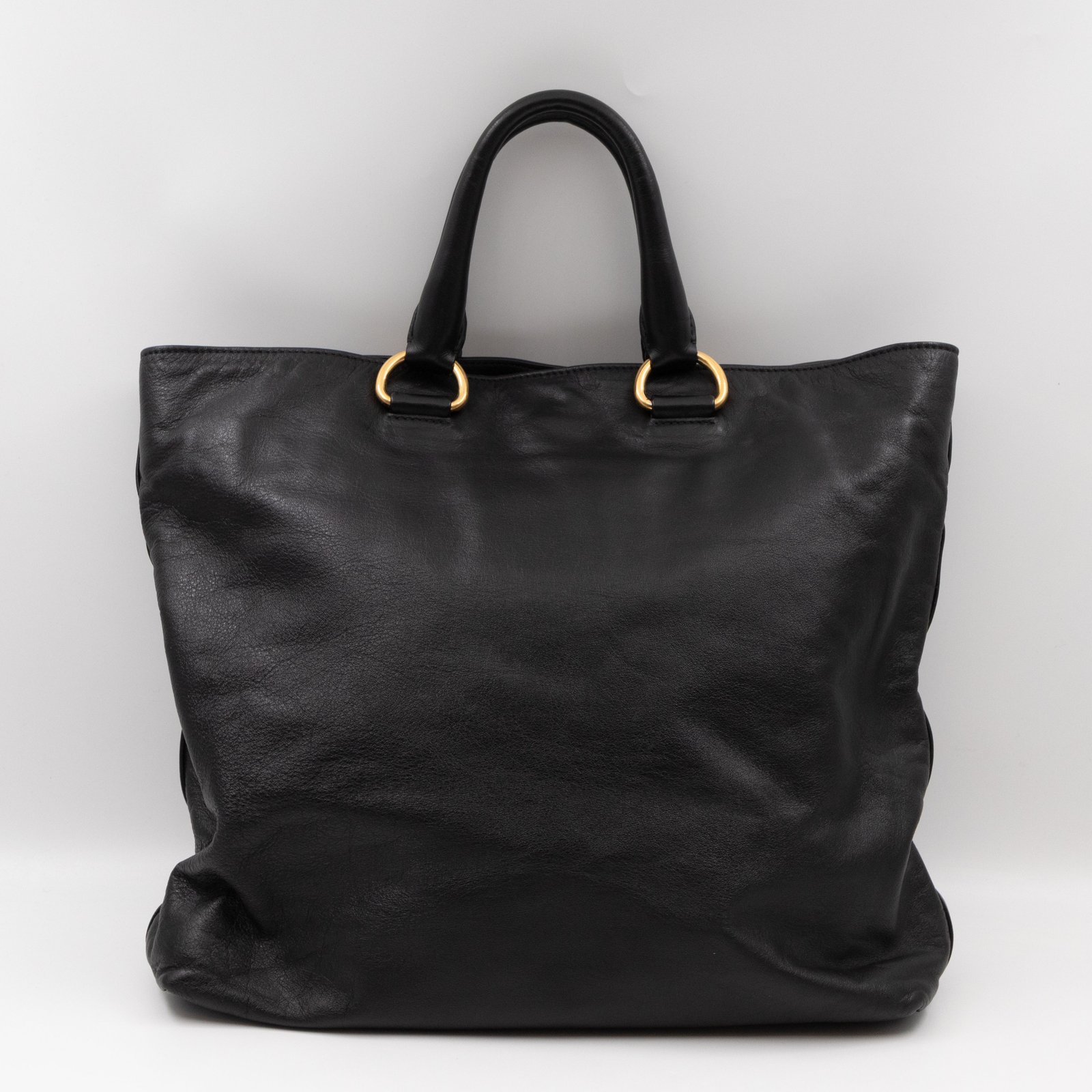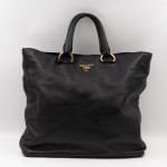 A large and charming shopping tote from Prada. Made with black leather with gold-tone hardware. Dual handles and an adjustable shoulder strap. Spacious insides with slim pocket on one side and a large zipper pocket on the other side. Button closure in the middle to keep your items safe.